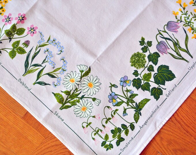 Swedish vintage 1970s printed cotton summer-table-cloth with multicolor Sweden landscape wildflower motive on white bottomcolor