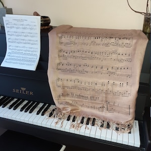 Printed on a soft , beige colored viscose shawl with linen texture.