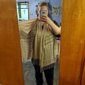 Perfect! Very soft, lightweight material which is what I was looking for. Text placed well placed on the shawl so it's easy to display. Very happy with my purchase, thank you!