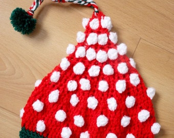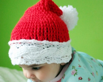 Crochet jolly yuletide cable red Father Christmas Santa hat in red and sparkly white. It is one of my proudest Elf Hats. It is a great accessory to add to a cute baby St Nick Xmas outfit for girls or boys! Handmade with love by Babamoon ©