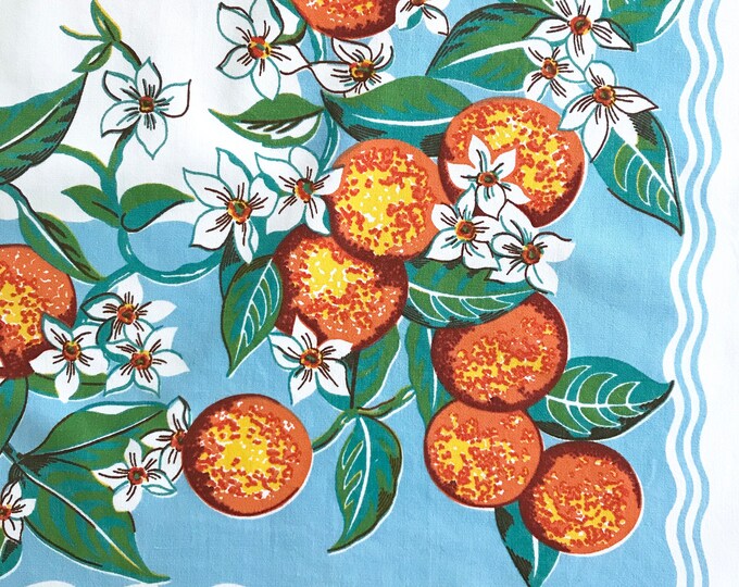 RARE Vintage Tablecloth ORANGES Blossoms FRUIT Square Table Cloth Aqua Blue Orange Vicray?