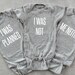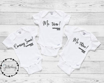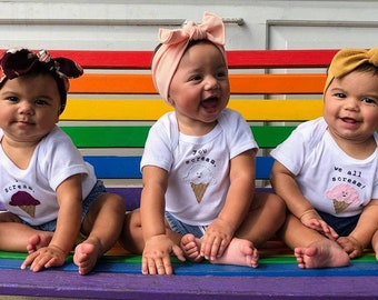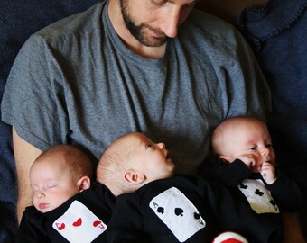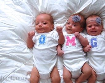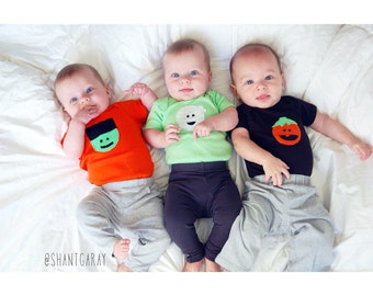 these are hand-cut(from repurposed t-shirts) and sewn onto LONGSLEEVE bodysuits for triplets, or different sized tees for siblings!
