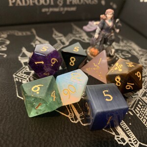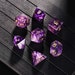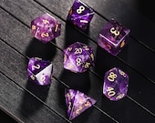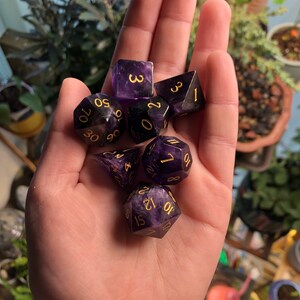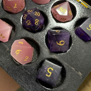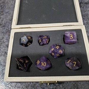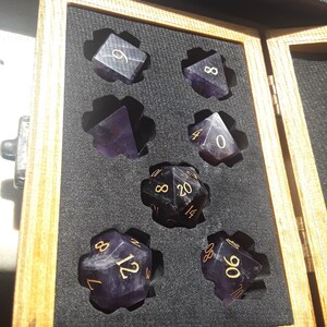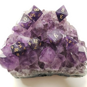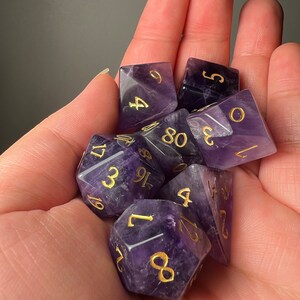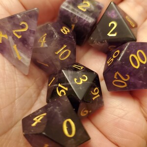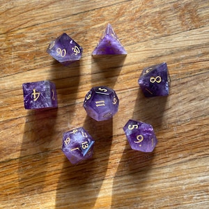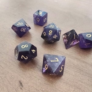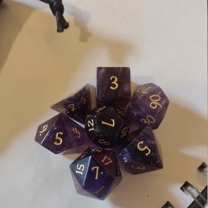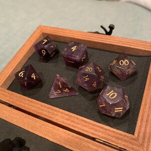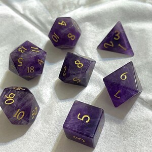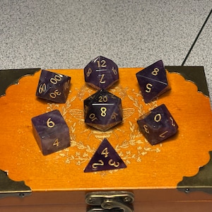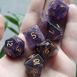 Check the "Dice Box" section of our store to get a unique retro wooden dice box by the below link:https://www.etsy.com/shop/crystalmaggie/?section_id=35676938The full set will come with D4 D6 D8 D10 D% D12 D20.11 dice set will come with D4 D6x4 D8 D10 D% D12 D20x2 (the full set + D6x3 + D20).Material:Natural amethyst.FYI:Slight variations in color, size, and shape are possible because they are all handcrafted. We encourage you to embrace the individual beauty of these dice and enjoy the age-old hand-crafted methodology.Difficulty Making Decisions? Buy mystery dice set -> https://www.etsy.com/listing/1106073347/mystery-dnd-dice-setStill not what you want?Make your custom dice -> https://www.etsy.com/listing/720515045/custom-dnd-dice-set*WARNING*: KEEP THEM AWAY FROM PETS, CHILDREN, AND MOUTHS.