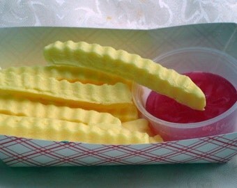 You'll receive 4 chicken nuggets, 8 french fries, and a Sweet and Sour sauce dipping cup (yes, that's soap too - just pop out of the plastic container and enjoy!) It doesn't end there, though because it's not a fun kids meal until there's a toy there, too. Included is a brand new, packaged toy (styles will vary - the toys may contain small parts, so we recommend these for children 3 and up). Upon checkout,mention if you'd like a toy for a boy or a girl (if no preference is mentioned, you'll receive a neutral toy). It is all packaged in a decorative food-style bag. A great gift and party favor idea!