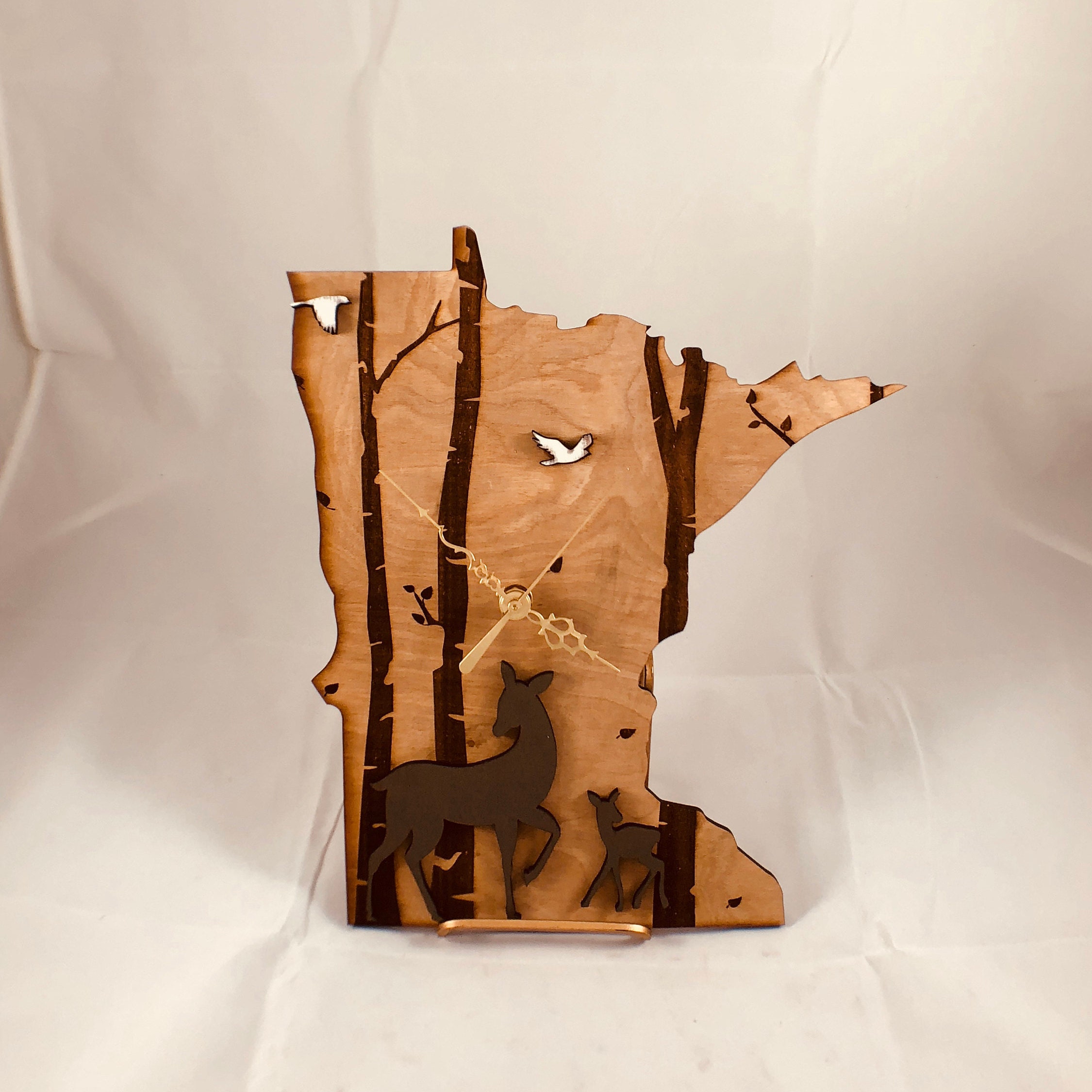Laser Etched Minnesota Clock with Natural Wood with Stained Wildlife