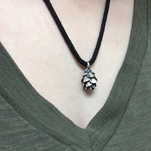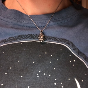This pine cone necklace is made from solid sterling silver. The pendant measures 7/8" or 22 mm including the bail. The cone comes from a hemlock, a common tree in Upstate New York. Choose from 16" or 18" 1 mm ball chain, or 20" 1.5 mm ball chain. Oxidation emphasizes the detail. This was recently re-designed to have a slightly larger ring at top, which went from a 3 mm inside diameter to 4 mm. Total length is the same and the design is very similar otherwise. See photo for size comparison with my other pine cones and with the previous design.