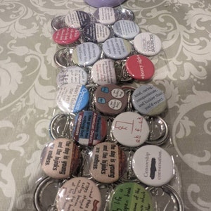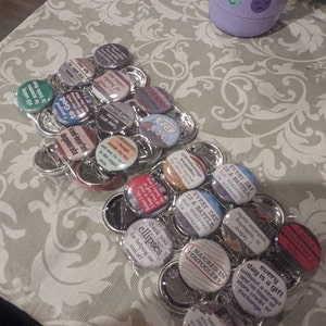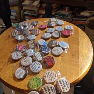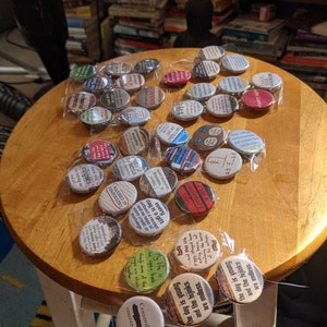 Buttons are 1.25" in diameter and all artwork is produced high res on a color laser printer.