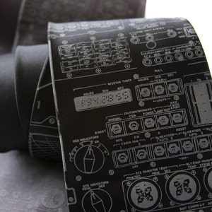Apollo Cockpit men's silk necktie. Rocket science silkscreened tie. Dove gray print. Your choice of tie colors.