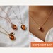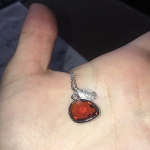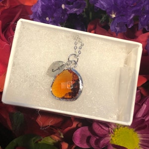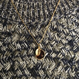 The silver or gold plated plated Topaz pendant is made of glass and is a gorgeous red/brown shade. It measures approximately 12.5x 16 mm and is hung on a 16", 18" or 20" chain. The chain options include silver-plated, gold-plated, rose gold-plated, sterling silver, 14K gold-filled, or 14K rose gold-filled metal. The chains are dainty and very pretty - the perfect delicate necklace for everyday wear. The silver plated leaf charm is approximately .25 inches and is subtly stamped with an initial. The necklace can be purchased without the leaf or you can add up to 4.