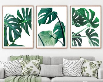 Monstera Leaves Set, 3 Piece Decor, Tropical Leaf Prints, Palm Leaf Wall Art, Monstera Deliciosa, Tropical Plant, Botanical Art, Green Leaf