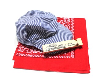 Train party favor includes conductor hat, train whistle and red bandana, train birthday favor, goodie bag contents