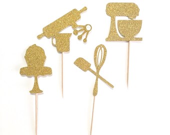 12 pc baking theme gold glitter cupcake topper little baker for birthday pretend play cook theme