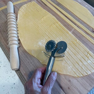 Does not cut through pasta. I had to use a pizza cutter to try to cut through the lines it made. Eventually, once the pasta dried a bit, I was able to "peel" the strips apart. But this is not a cutter at all. Ans since the handles do not spin, it really isn't a rolling pin. Rather it is just a piece of wood that makes line in the pasta. Not what I was hoping for at all.