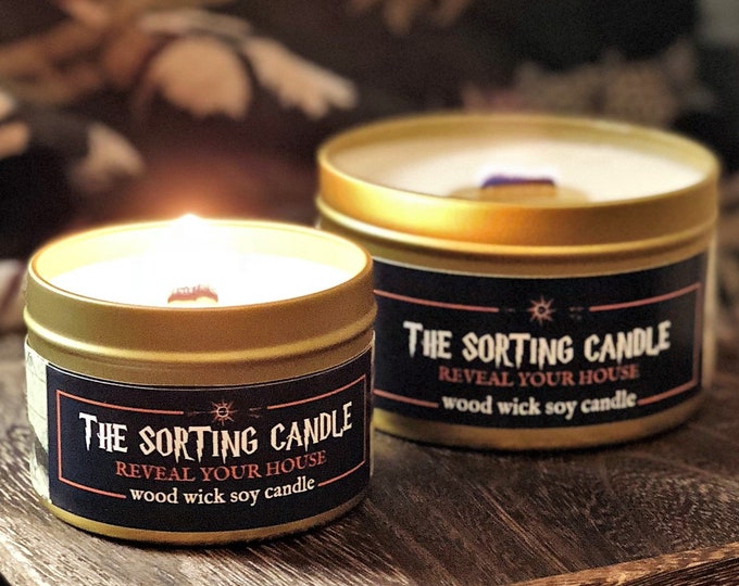 The SORTING CANDLE | Wood Wick, Soy, 4 oz | "Magically Changes Color and Scent" from Hat to Wizard School House | Geeky Nerdy Fan Book Gift