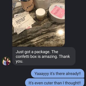 Absolutely loved it! My bestfriend was so happy with her personalized gift! She moved to SC and we never celebrated a birthday without eachother in over 15 years and since I live in Miami i wasn't able to see her. She was not expecting somethinf like Whiteconfetti box. This was different, this had more of a personal touch and she expressed that it felt like opening a party in a box. She felt special which was the main goal. Everything looked great. She created a video i wish i could share. I was able to capture what the actual box looks like. Even the box is beautiful and detailed. She says she will be using the box to store things. Again thank you to Whiteconfetti box creators, it was a perfect gift for my bestie.