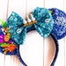Go under the sea with these Little mermaid inspired globe ears. Present are your favorite characters Ariel, Sebastian, and Flounder accompanied by their fish friends and collection of shells.