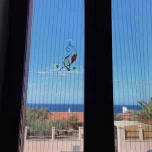 This tender stained glass hummingbird suncatcher is a lovely decor for your home or garden as this cute green bird with flower will gladden your eye every day. This marvellous work of art can be hanged on a window, and make you a bit happier by simply looking at it due to its beauty and vibrant colours. Besides, this bird could be hanged in the garden near a hummingbird feeder to attract birds’ attention. This adorable window hanging will be a unique gift for the loved ones.