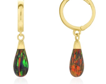 14k Solid Yellow Gold Pear Shaped Black Fire Opal Huggie Hoop Dangle Earrings 1"