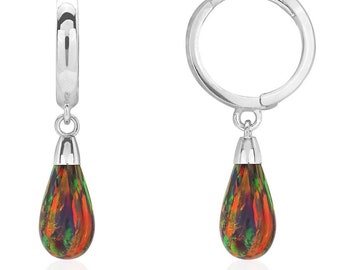 14k Solid White Gold Pear Shaped Black Fire Opal Huggie Hoop Dangle Earrings 1"