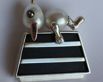 snoopy brooch...9ct gold, silver, 2 x southsea pearls, black diamond, ebony inlay