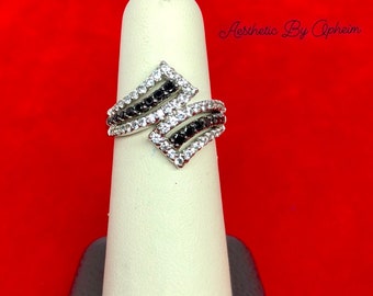 Vintage 1980s Pear Shaped Black Diamond Cubic Zirconia and Crystal Ring 18kt White Gold Plated Band Made in USA #R1897