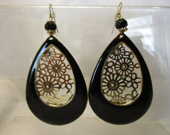 Huge Pear Shaped Black Dangle Earrings - fish wire