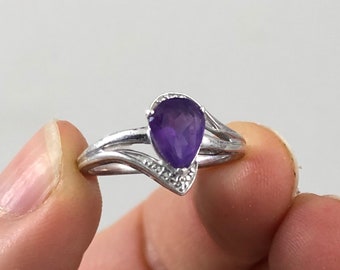 Vintage Sterling Silver Ladies Pear Shaped Amethyst and Diamond Ring