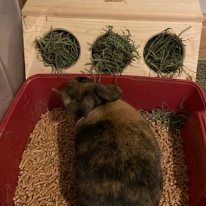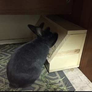 My boy loves this box! So much so that he's found out how to climb into it hahaha. Its been real helpful keeping the hay mess down + it's bunny safe, heavy enough not to tip, and durable af. They even sent me a cute chew toy that Cheese also likes! Did I mention that they are a rescue group and the money goes to buns??? Thank you SaveABunny :)