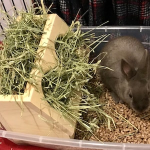 Holds a large amount of hay keeping it dry, clean and safe and fun for bunny to chew.