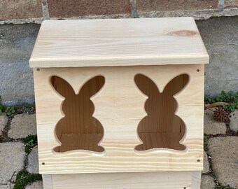 SaveABunny's Hay Saver boxes (patent pending) are individually handmade locally in San Francisco from pure, untreated pine wood. Safe, sturdy, handcarved and built to efficiently fit most common bunny condos.