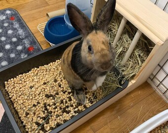 My boy loves this box! So much so that he's found out how to climb into it hahaha. Its been real helpful keeping the hay mess down + it's bunny safe, heavy enough not to tip, and durable af. They even sent me a cute chew toy that Cheese also likes! Did I mention that they are a rescue group and the money goes to buns??? Thank you SaveABunny :)