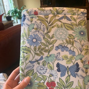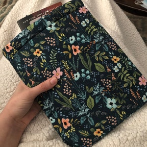 Book Sleeve is made from beautiful floral print. Sleeve is fully lined with coordinating fabric and padded to make it very soft and gives great protection for whatever you put inside.