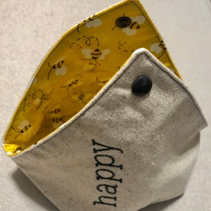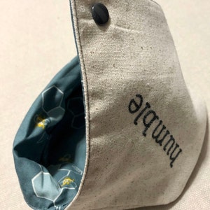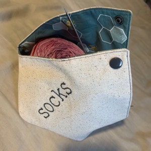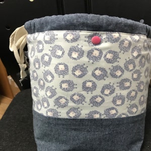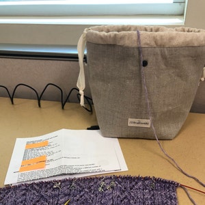 Fully lined in 100% cotton heavyweight muslin. Light colored interior makes it easy to see contents of bag. No exposed seams making bag smooth and snag free. Bag is constructed with interfacing throughout to provide body and durability. Detachable swivel hook strap. Cotton twill tape drawstring closure and KAM snap at top. One Interior patch pocket. Bag has flat bottom and can stand on its own. Bag will easily hold two 50g skeins of medium weight yarns. Yarn not included :(