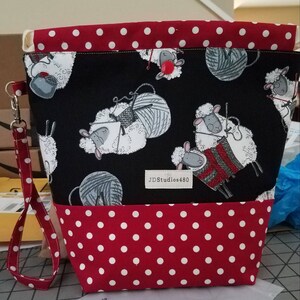 This project bag is SOO EWE. Who doesn't love a knitting sheep? This fun Timeless Treasures "Do Ewe Knit?" print is paired with a red and white polka dot. So fun...