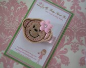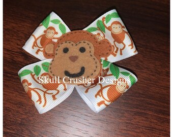 this is a great clip for a mod monkey party theme or for an everyday clip. this sweet monkey has a pink flower with swarovski accent and is on a light pink alligator clip.