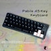 Stunning piece of kit. The frosted acrylic looks great and assembly was simple. I swapped the silver screws for black screws to complement the WoB keycaps I have on order. The sizes are M3x6mm (bottom) and M3x10mm (top). It is roughly the same size as my 60% (pictured) and does not have any typing angle. I added my own rubber feet to create a minimal incline.