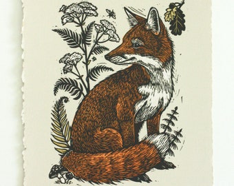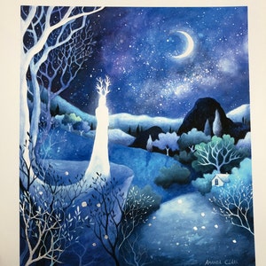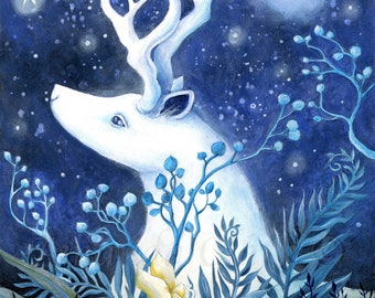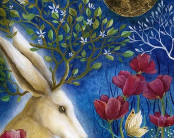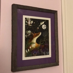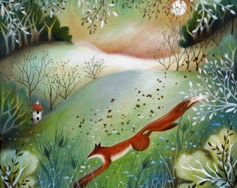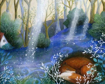 Print titled 'Under the Magnolia Tree' by Amanda Clark - fairy tale, illustration, sparkles, home decor, fox art, flower art
