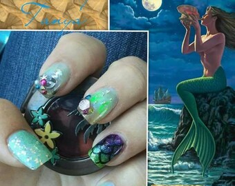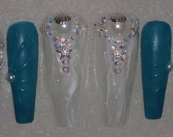 Under The Sea ~ reusable press on bling nails with kit nail art hand painted xlong sz medium coffin ocean clam 3D