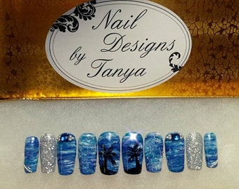 Sea Scape ~ Professionally made Nail Designs by Tanya press on ocean bling nails with kit custom art hand painted medium length coffin small