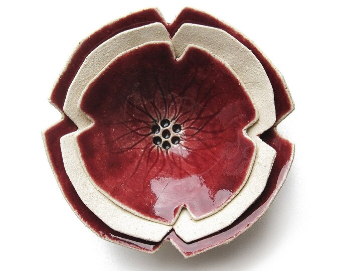 Nesting bowl trio Poppies Set of three cream and ruby red stoneware bowls Feminine home decor gift for her under 100