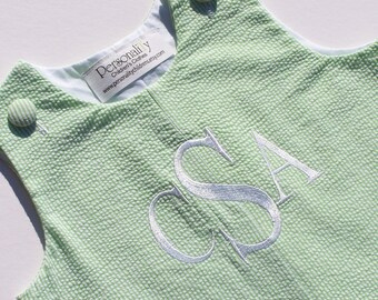 (2) the font style of the monogram. Please note that the particular font shown in the picture with the little boy in blue seersucker is no longer available. I found that it didn't hold up well after machine washing. You can view available fonts at https://personalitychildrens.com/monogram-options. My favorite is Times New Roman that is pictured on the green seersucker in the listing.