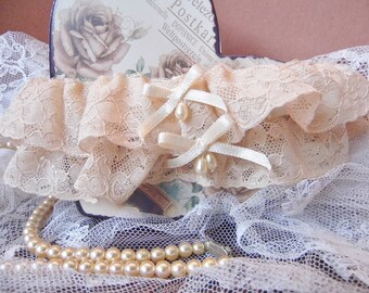 Vintage French Lace and Silk Bridal Garter in Pale Peach and Cream