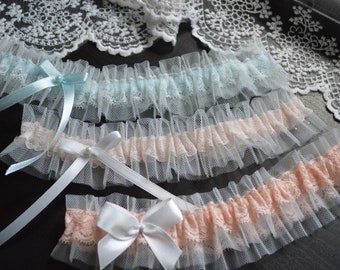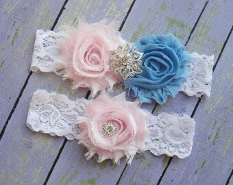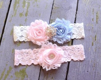 ON SALE Wedding Garter Set, Pink and Blue Garters, Dusty Blue Garter, Something Blue Garter, Powder Blue Garter, Pale Pink Wedding
