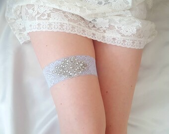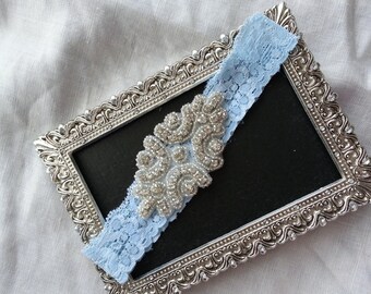 Blue bridal garter, wedding garter, PALE POWDER BLUE lace garter, Embellished rhinestone applique, bridal garter, garter with rhinestones