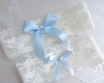 SALE Ivory stretch Lace Garter with pale blue bows , something blue garter