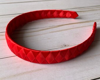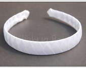 Are you looking for a nice hair accessory for Easter but your daughter refuses to wear bows? Or maybe you are shopping for a flower girl or bridesmaid?? This woven headband is 3/4" wide at its widest point. It is made with white satin ribbon. The woven pattern is beautiful in satin!!