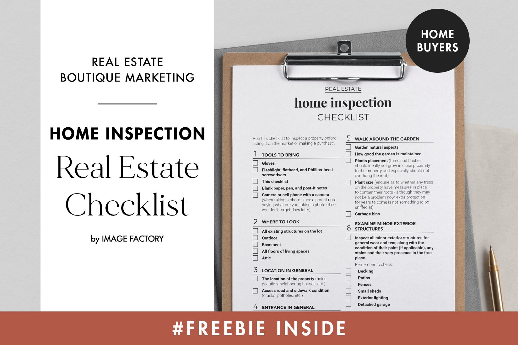 Are you a buying agent constantly educating your buyer clients? This clean and professional Home Inspection Checklist is designed as a real estate lead magnet for resourceful realtors and agents to share with buyer clients. Use it as an opt-in freebie, put it into a buyer packet, or hand it on a client meeting.