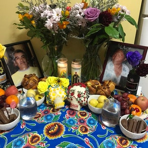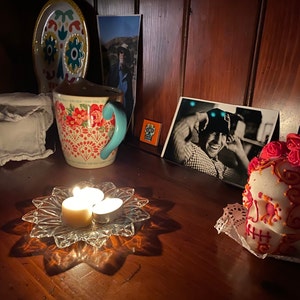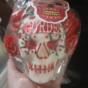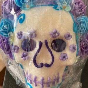 The sugar skull is absolutely beautiful! It came very quickly, which I very much appreciated as I was late in getting things together for my ofrenda. It was packed very carefully and made it to me with no issues. Thank you so much! (in the photo it is still in the plastic wrap, but I was just protecting it before Dia de muertos.)