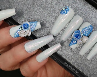 Bridal Nail Art 3D Flowers Blue Press on Nails Shimmer Finish Wedding Nails Bridal Gift for Her Romantic Nails with Roses 3D Floral Nails