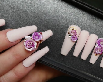 Bridal Nail Art 3D Flowers Nude Press on Nails Matte Finish Wedding Nails Bridal Gift for Her Romantic Nails with Roses 3D Floral Nails